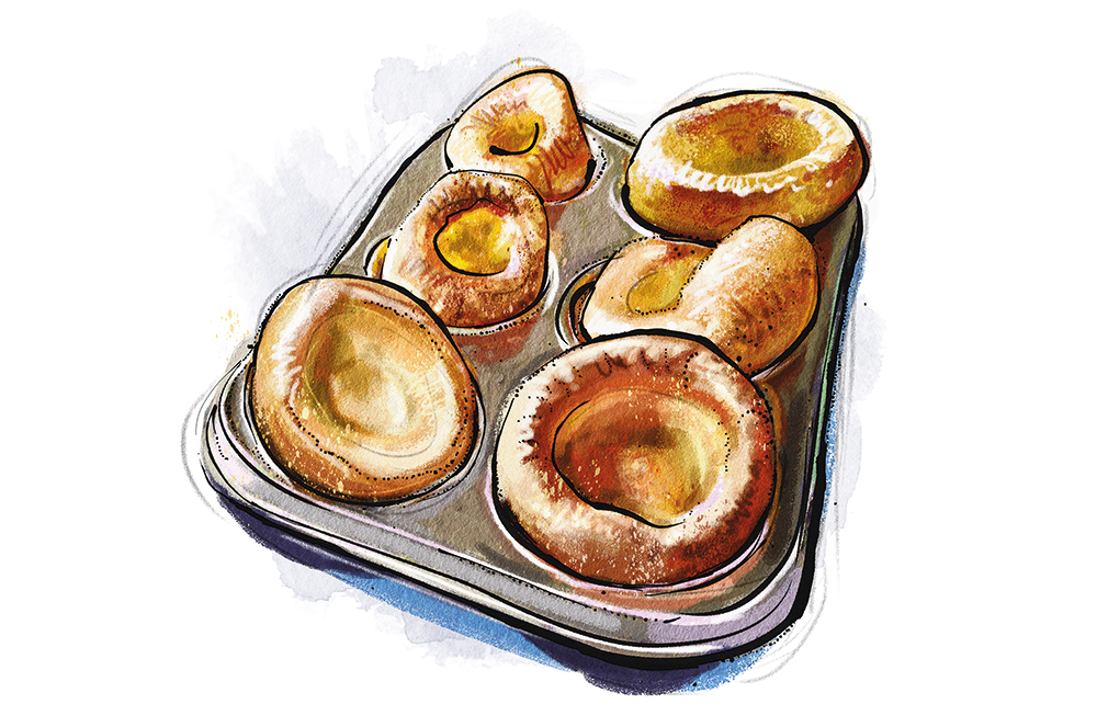 The first written recipe for a ‘dripping pudding’ was in 1737, although it is far older. The pudding would sit below the spit–roasted joint of meat, with the fat dripping on to it. In the mid-1700s, Hannah Glasse wrote about it as a Yorkshire pudding, but the Yorkshire connection is probably spurious. Yorkshire puddings are one of those things – a little like roast potatoes – that are taken very seriously by those who make them. I’m not sure anyone has ever made a Yorkshire pudding without declaring their method of cooking the one true way. But there is something almost all Yorkshire pudding aficionados agree on: the secret to a good rise is to pour the batter into screamingly hot fat. Whether you use vegetable oil or dripping, it should be put into the pan and preheated until smoking, so that the batter sizzles as it hits the hot, hot fat.