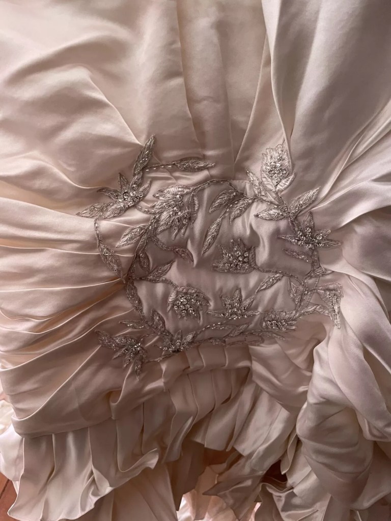 The Christian Dior gown was designed by John Galliano. It took over 500 hours to hand-sew 1,500 Swarovski diamonds onto its 13-foot train. Its reported original manufacturer’s suggested retail price was $210,000, but it will now be sold at a fraction of the price after being worn only a handful of times.