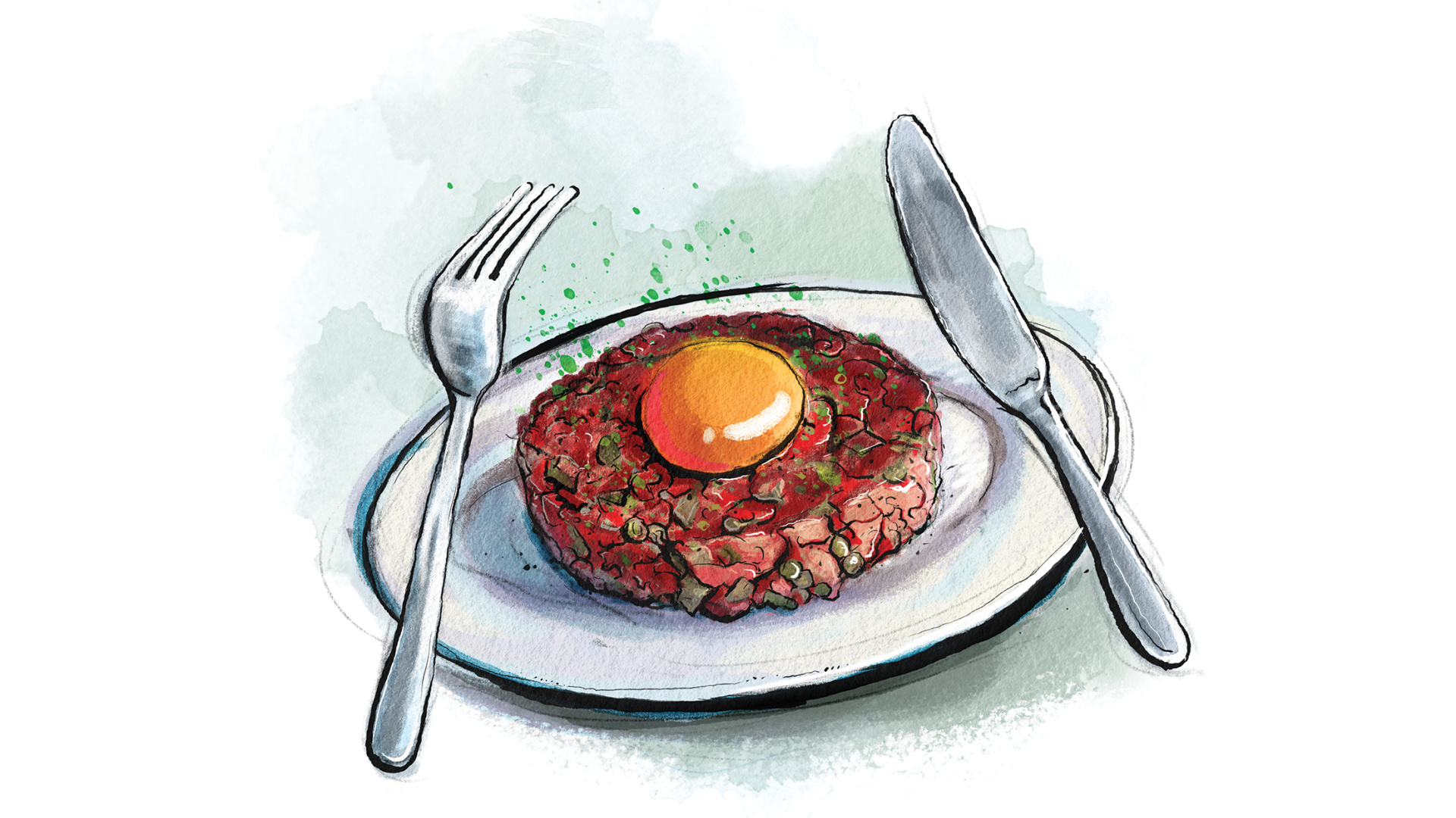 Whenever I think of steak tartare, I can’t help but remember a heartbreaking passage in Nigel Slater’s memoir Toast. Slater, working at a French restaurant in a Midlands hotel as a young man, is desperate to try the steak Diane. He books a table there for himself and a date. In a moment of madness, he accidentally orders the steak tartare instead. Expecting a rich, cream-spiked, butter-fried, brandy-flambéed steak, he is first surprised, and then horrified when a waiter begins chopping up raw meat alongside him. ‘I felt cold, then hot, then cold again. The little egg yolks seemed to be looking up at me, laughing. Then everyone was laughing.’ He goes outside and faints.