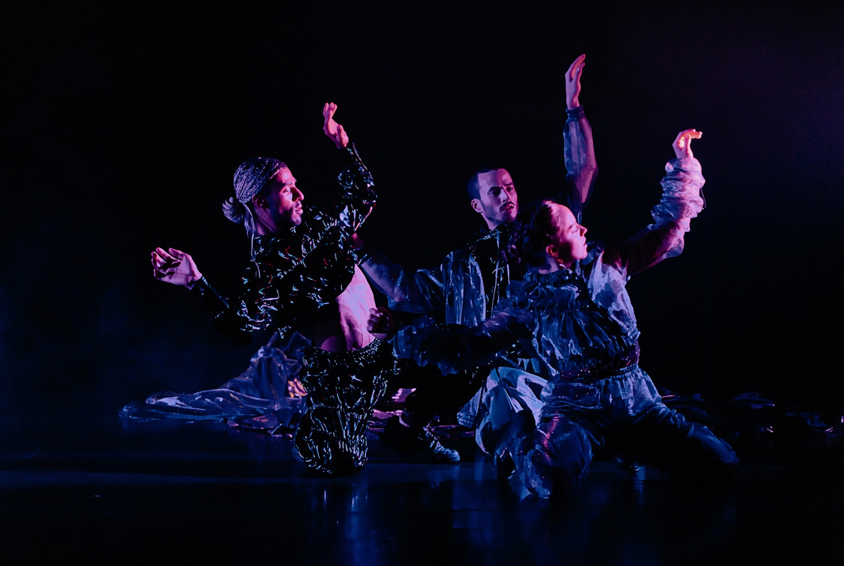 There’s less sensation in the dancing, which is likewise fragmented. Two men join Gheller for bursts of choreography that leap from breathy to fleet to choppy. We see slow-motion headspins and Matrix-style backbends, with leaps and wavy bellydances sprinkled in. The best scene involves a tarp, the dancers tussling underneath to create a craggy mountain that lumbers downstage. A poppy backbeat throbs as they crumble to the floor and reanimate as silhouettes, faces straining against the fabric. I’m not convinced by the woo-woo connection to amethysts — ‘A performance… responding to the texture and the guidance properties of this regal stone,’ read the programme notes — but I dig the punchy imagery at work.