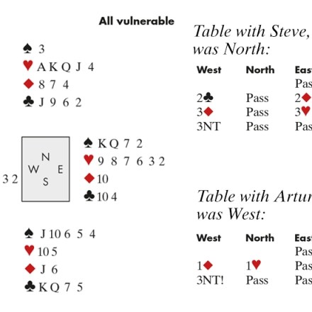 One of the pleasures of kibitzing online tournaments is that when an intriguing hand comes up, you can flick back and forth to see how different players tackle it. I’m drawn in particular to players whose boldness and imagination always make them highly entertaining to watch — two of whom are Artur Malinowksi and Steve