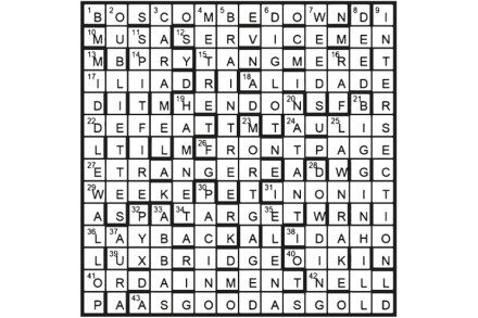 The announcement reads: ‘Fifty years ago, on July the third, Jac’s first crossword in this series was published.’ The shaded squares (from top to bottom) can be arranged to reveal SMURF, SARAH (Hayes, aka La Jerezana) MR MAGOO, MASS, COLUMBA, DOC, PABULUM, MARK (Kelmanson, aka CheeseCracker), ASCOT, RICHARD (Browne, aka Fieldfare) and JAMES (Brydon, aka