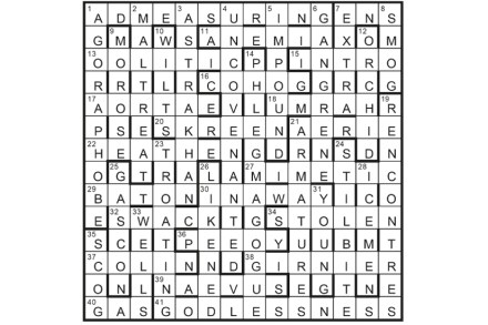 Unclued lights were characters in the musical Oklahoma!, 2/20, 4A, 10, 22, 24, 30, 35/15D. They are AUNT ELLER, WILL PARKER, LAUREY WILLIAMS, ALI HAKIM, CURLY MCLAIN, JUD FRY, and ADO ANNIE. OK (all right) is the abbreviation for the state First prize Carole Smallhorn, Moreton-in-Marsh, Glos Runners-up Ian Dempsey, Oldwick, New Jersey; Roger Dickinson,