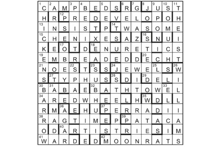 Redundant words were 12A virgin, 16A crazy, 38A mammal, 18D state, 21D greed, 25D tendon, 34D extremist. These respectively defined 14A vestal, 20D lunatic, 6D marsupial, 23D Indiana, 33A cupidity, 15A paxwax, 41A absolutist. Roman gods (underlined) in these words were turned into their Greek equivalents. First prize Nadya James, Heanor, Derbyshire Runners-up Ben Stephenson, London