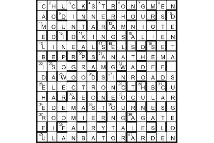 The paired unclued lights are food items which include a place-name. BATH and BUNS do double duty, BUNS is the plural and BRIGHTON ROCK is the literary reference. The pairs are 1A/22, 8/12, 8/14, 11/14, 13/33, 31A/25D, 38/37 and 39/30. First prize Leslie Mustoe, Hitchin, Herts Runners-up Sandra Speak, Dursley, Glos; Morris, Birchington, Kent