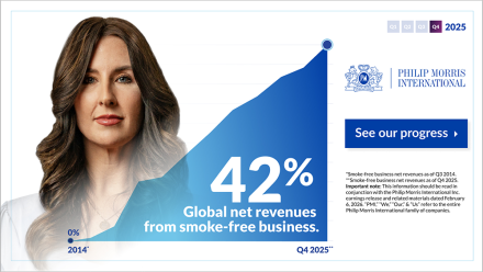 At Philip Morris International, our mission is clear: to reduce smoking by replacing cigarettes with better smoke-free alternatives for adult smokers. Learn more at PMI.com/Progress
