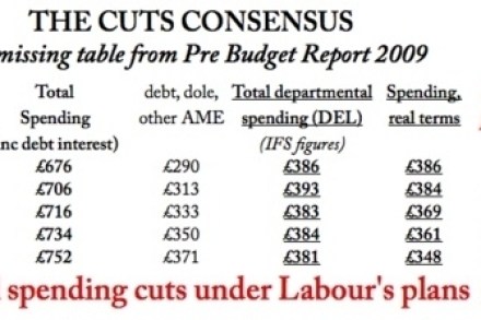 Fireworks at Labour’s press conference this morning, thanks to some brilliant questioning of Mandelson and Balls about the cuts which Labour is concealing from the public. A while ago, the FT did its own version of a table that Coffee House ran in February: the implied cuts that departments will make under HM Treasury forecasts. I reprint it below. The IFS has sought to quantify these cuts. So Sky’s Adam Boulton read out this list and confronted Mandelson: which of these would Labour not do? Freezing benefits? Cutting public sector pay? Halving the spend on teaching assistants? Cutting funding to Wales and Scotland? Nick Robinson from the BBC piled in
