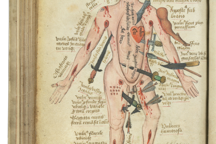 ‘Full of strokes and blows/ broken, pitifully wounded’, the man, naked, or almost so, stands full frontal, legs and arms parted, one limb sometimes slightly bent to signal the beginning of a movement. His body is punctured by lesions and wounds, with small depictions of their material causes attached almost as adornment – knives or weapons aimed at cutting and bruising, but also accidental instruments of damage to the skin such as thorns or nails or even living agents – a rabid puppy with sharp teeth. Scratches, buboes and insect bites are also visible. The image of the ‘Wound Man’ (or rather, images with variations) first emerges at the end