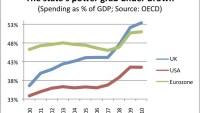 In the table below, we consider how the budgets of various departments grew over the last Labour government. It spells out the very large rises in Health and Education (together, the rises in these two departments accounted for 61 percent of the total rise in departmental expenditure over the period). And we can see that other departments, such the Foreign Office, experienced cuts. Then, in the later columns, we consider what percentage falls today’s cuts represent and what proportion of the total rises since 2004/5 they undo. We see that the largest cuts fall on CLG communities, down by 7.3 percent, reversing 74 percent of the rises over the last