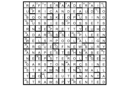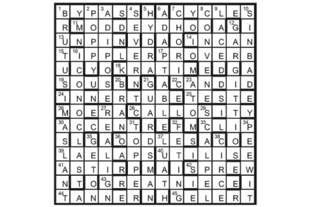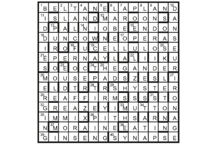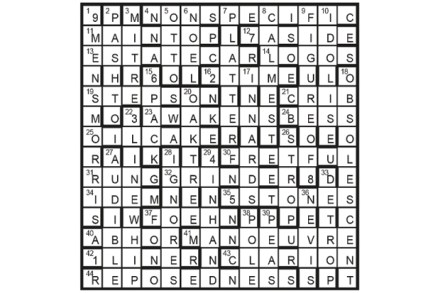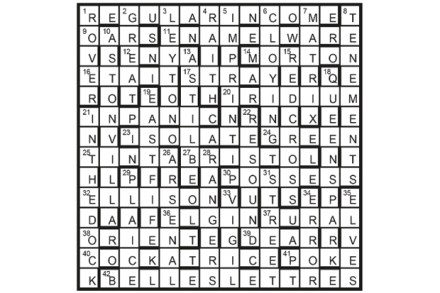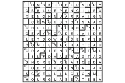 The unclued lights (one of two words) can be preceded by the same word which is hidden in the completed grid. Solvers must highlight this word appropriately. All resulting phrases are verifiable in Brewer. Elsewhere, ignore one accent. Across 1 Ought to be quiet when dreadfully loud (6) 7 Elysian areas of knowledge? (6)