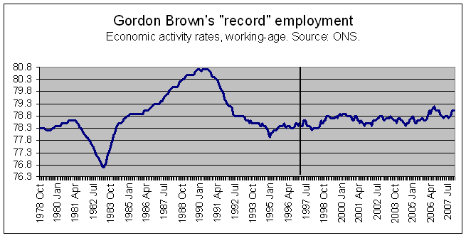 Gordon Brown frequently asserts Britain has record employment or that Labour has “the best employment record in history” (Hansard, 16 Jan 08). In fact this honour goes to Nigel Lawson whose achievements Brown has never been able to come close to. Brown has specialised in finding alternatives to work – welfare, studenthood, etc. But here