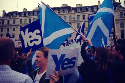 In Glasgow, it’s difficult not to conclude that the ‘Yes’ camp has the momentum in these final few days. There are ‘No’ badges, posters and flags around the city, but they’re drowned out by the number of ‘Yes’ posters, and the excitement that ‘Yes’ events are creating. Last night I visited a perfectly jolly ‘Yes’