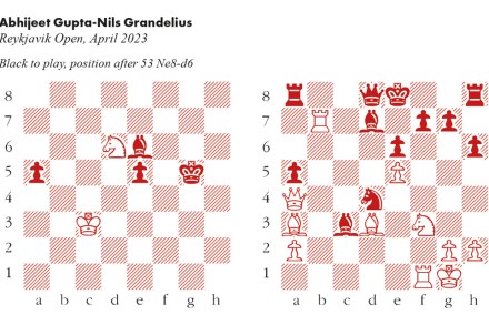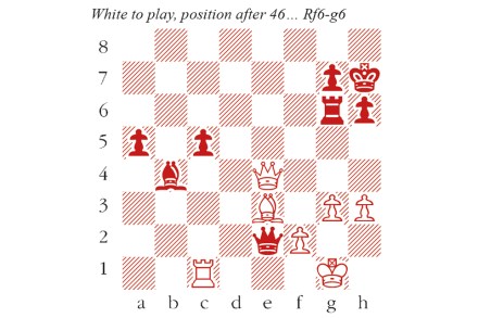 White to play. Another variation from McShane – Carlsen, London Chess Classic 2012 (in case of 32…Qf6-f5) Carlsen avoided this position, since he had spotted a winning move for White. What was it? Answers should be emailed to chess@spectator.co.uk by Monday 29 May. There is a prize of £20 for the first correct answer out
