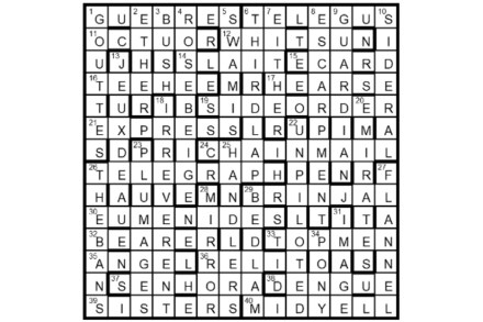 The unclued lights include the name of a British daily newspaper; 3/26A, 9/35, 12, 24, 28/31D and 34/21. First prize Susan Hay, Old Perton, Staffs Runners-up Alison Gillam, Knotty Green, Bucks; Laurence Pearce, Lympstone, Devon