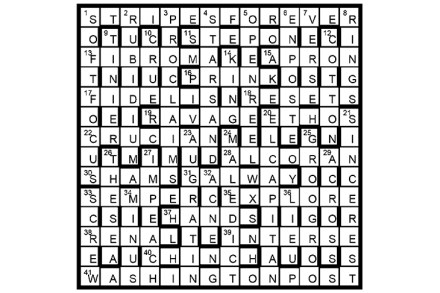 Unclued lights are marches by John Philip SOUSA, as hinted by the title: 4/1A, 14/12, 20D, 33A/17, 37/29/26, and 41 First prize Thulasi Karunakaran, Thame, OxfordshireRunners up Susan Hay, South StaffordshirePeter Moody, Fareham, Hampshire